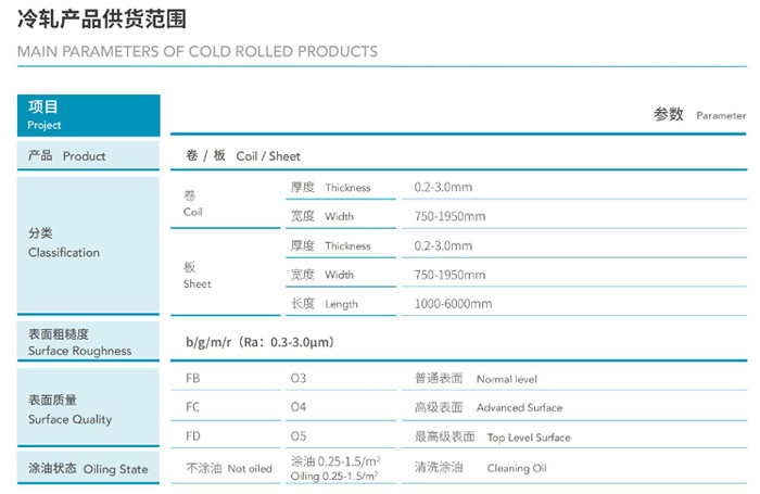 五條冷軋線,年產(chǎn)量 750 萬噸??晒┖穸?0.2-3.0mm,寬度 750-1950mm 的冷軋產(chǎn)品。