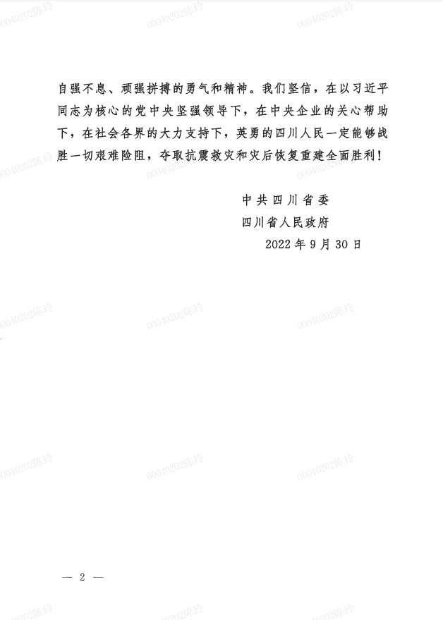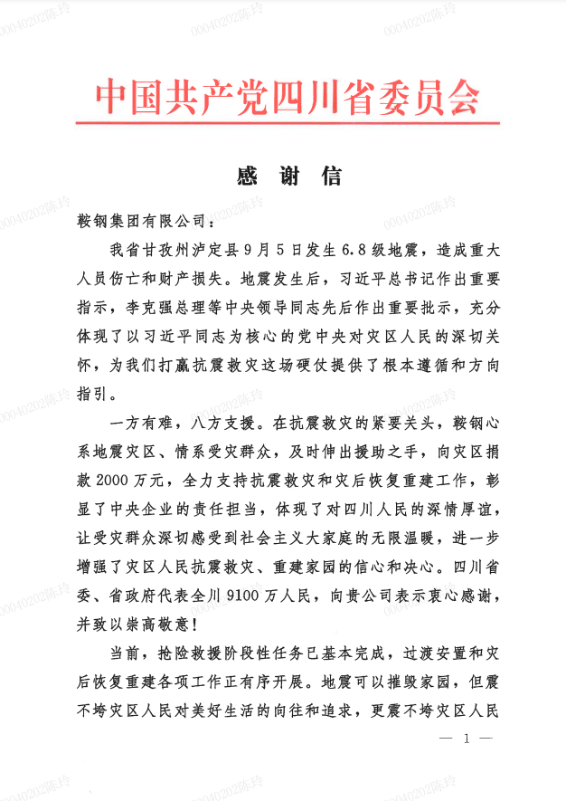 鞍鋼集團(tuán)堅決貫徹習(xí)近平總書記重要指示精神,落實黨中央、國務(wù)院決策部署,積極履行央企使命責(zé)任,2022年9月7日,緊急向四川省慈善總會捐贈2000萬元,用于支援四川省抗震救災(zāi)及災(zāi)后重建工作。 2022年9月5日12時52分,四川甘孜州瀘定縣發(fā)生6.8級地震,造成重大人員傷亡和財產(chǎn)損失。四川災(zāi)情時刻牽動著鞍鋼集團(tuán)廣大干部職工的心。鞍鋼集團(tuán)高度重視,迅速響應(yīng),第一時間安排駐川企業(yè)全力以赴做好支援抗震救災(zāi)工作。 鞍鋼集團(tuán)表示,將與四川人民心手相連、同舟共濟(jì)、共克時艱,全力支持抗震救災(zāi)和災(zāi)后重建工作,為堅決打贏抗震救災(zāi)這場硬仗作出應(yīng)有貢獻(xiàn)。