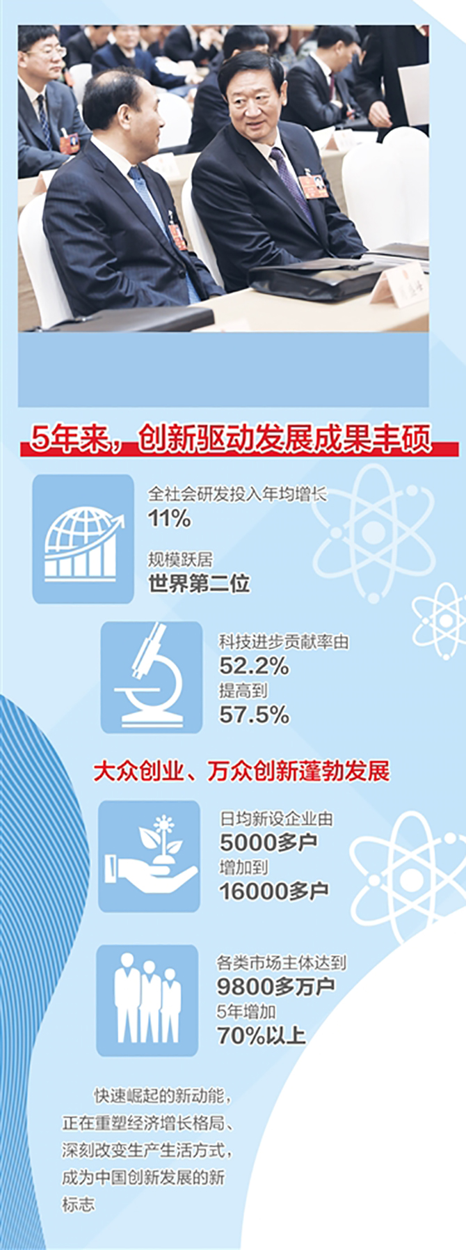 這5年,創(chuàng)新驅(qū)動發(fā)展成果豐碩。全社會研發(fā)投入年均增長11%,規(guī)模躍居世界第二位;科技進步貢獻率提高了5.3個百分點;載人航天、深海探測、量子通信、大飛機等重大創(chuàng)新成果不斷涌現(xiàn);高鐵網(wǎng)絡、電子商務、移動支付、共享經(jīng)濟等引領(lǐng)世界潮流……這一切,都源于我們實施的創(chuàng)新驅(qū)動發(fā)展戰(zhàn)略。在今年兩會上,代表委員圍繞“創(chuàng)新”這個關(guān)鍵詞,有講不完的話題。