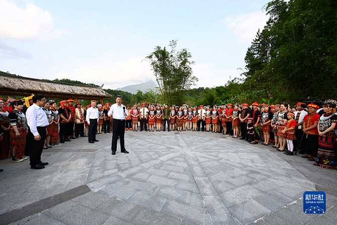 習(xí)近平沿長廊察看黎族特色農(nóng)產(chǎn)品和黎錦、藤編等非物質(zhì)文化遺產(chǎn)展示。廣場上,歌聲悠揚(yáng)、鼓樂齊奏,村民們跳起竹竿舞迎接遠(yuǎn)方的客人。習(xí)近平親切地對(duì)大家說,很高興來看望黎族鄉(xiāng)親們,看到你們過上幸福生活,我感到很欣慰。我們?nèi)娼ǔ尚】瞪鐣?huì)以后,還要繼續(xù)奔向全體人民共同富裕,建設(shè)社會(huì)主義現(xiàn)代化國家。鄉(xiāng)村振興要在產(chǎn)業(yè)生態(tài)化和生態(tài)產(chǎn)業(yè)化上下功夫,繼續(xù)做強(qiáng)做大有機(jī)農(nóng)產(chǎn)品生產(chǎn)、鄉(xiāng)村旅游、休閑農(nóng)業(yè)等產(chǎn)業(yè),搞好非物質(zhì)文化遺產(chǎn)傳承,推動(dòng)鞏固拓展脫貧攻堅(jiān)成果同鄉(xiāng)村全面振興有效銜接。各級(jí)領(lǐng)導(dǎo)干部要貫徹黨的群眾路線,牢記黨的根本宗旨,想群眾之所想,急群眾之所急,把所有精力都用在讓老百姓過好日子上。