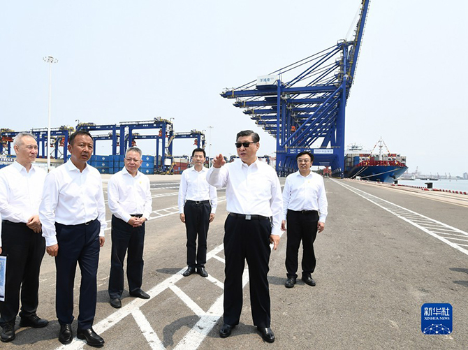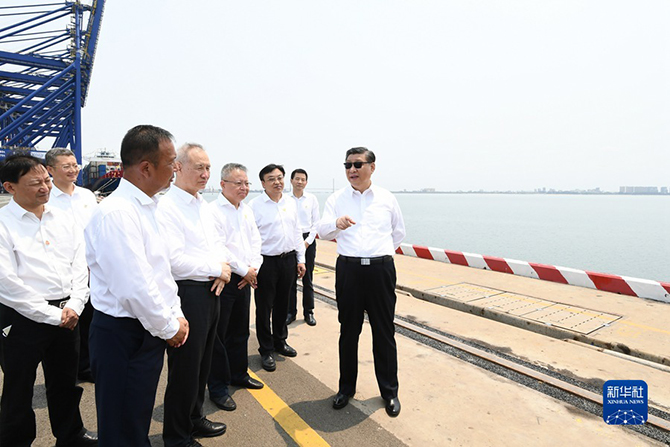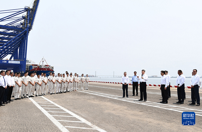 隨后,習(xí)近平來到洋浦國際集裝箱碼頭小鏟灘港區(qū),了解港口建設(shè)發(fā)展情況,同現(xiàn)場作業(yè)人員、掛職干部代表等親切交流。習(xí)近平強(qiáng)調(diào),振興港口、發(fā)展運(yùn)輸業(yè),要把握好定位,增強(qiáng)適配性,堅(jiān)持綠色發(fā)展、生態(tài)優(yōu)先,推動(dòng)港口發(fā)展同洋浦經(jīng)濟(jì)開發(fā)區(qū)、自由貿(mào)易港建設(shè)相得益彰、互促共進(jìn),更好服務(wù)建設(shè)西部陸海新通道、共建“一帶一路”。他指出,黨中央選派干部來自由貿(mào)易港掛職,既體現(xiàn)了黨中央對(duì)自由貿(mào)易港建設(shè)的關(guān)心和支持,也是對(duì)干部的培養(yǎng)鍛煉,要發(fā)揮掛職干部的積極作用,讓他們?cè)诨鶎右痪€增長才干。