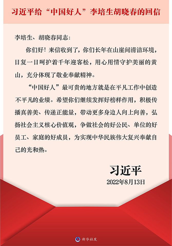 新華社北京8月14日電 中共中央總書記、國(guó)家主席、中央軍委主席習(xí)近平8月13日給安徽黃山風(fēng)景區(qū)工作人員李培生、胡曉春回信,對(duì)他們繼續(xù)發(fā)揮“中國(guó)好人”榜樣作用提出殷切期望。