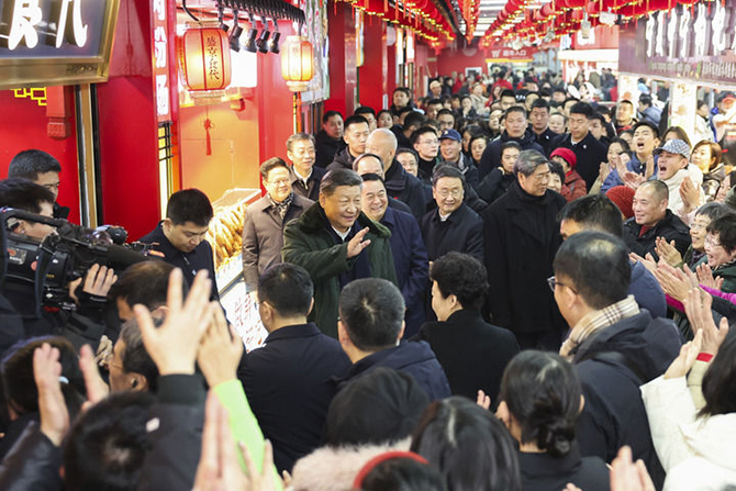 沈陽大東副食品商場歷史悠久,富有特色的年節(jié)商品琳瑯滿目。23日上午,習(xí)近平來到這里,察看多家店鋪,頻頻同店主和顧客交流,詳細(xì)了解節(jié)日期間市場供應(yīng)情況。大家見到總書記都十分激動(dòng),連聲歡呼“總書記好”!習(xí)近平對(duì)大家說,“菜籃子”、“米袋子”、“果盤子”是民生大事,現(xiàn)在物質(zhì)豐裕,過年團(tuán)圓更要讓大家吃得好、吃得健康。