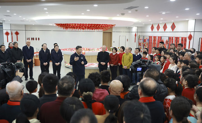 社區(qū)黨群服務(wù)中心里,一些社區(qū)居民在寫春聯(lián),孩子們編著中國結(jié)。習(xí)近平來到他們中間,不時(shí)贊賞他們的作品,勉勵(lì)他們更好傳承弘揚(yáng)中華優(yōu)秀傳統(tǒng)文化。習(xí)近平還饒有興致地欣賞了社區(qū)退休人員表演的笛子合奏曲。他深情地對(duì)大家說,過好春節(jié)意味著新一年有一個(gè)好的開端,家家戶戶幸福生活、老老少少開心快樂,就是人間美景。我們要一起努力,讓這美景越來越靚麗。