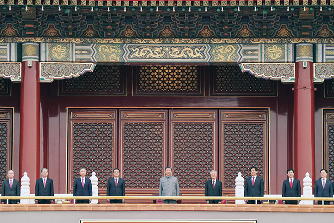 上午7時(shí)53分,在歡快的樂(lè)曲聲中,習(xí)近平等黨和國(guó)家領(lǐng)導(dǎo)人來(lái)到天安門(mén)城樓主席臺(tái),全場(chǎng)爆發(fā)出熱烈掌聲。