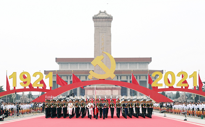 天安門(mén)城樓莊嚴(yán)雄偉,城樓紅墻正中懸掛著毛澤東的巨幅彩色畫(huà)像。天安門(mén)廣場(chǎng)上,人民英雄紀(jì)念碑巍然矗立。紀(jì)念碑北側(cè),高7.1米、寬7.1米的中國(guó)共產(chǎn)黨黨徽和“1921”“2021”字標(biāo)格外醒目。廣場(chǎng)東西兩側(cè),100面紅旗迎風(fēng)招展。