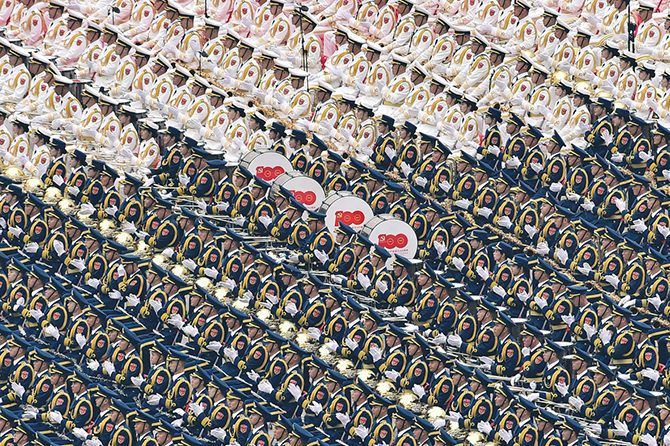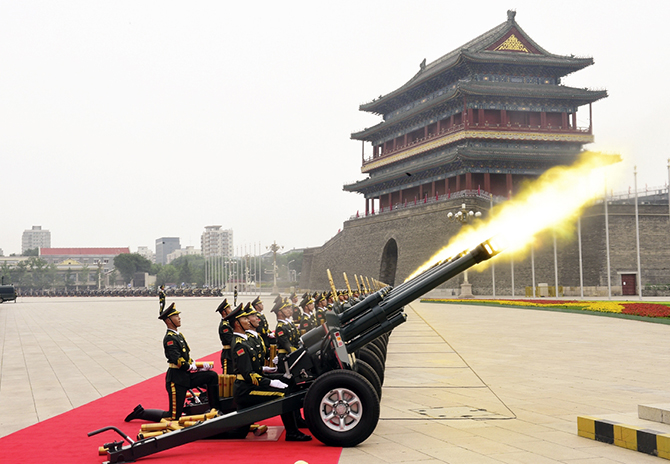 全體肅立,100響禮炮響徹云霄,國(guó)旗護(hù)衛(wèi)隊(duì)官兵護(hù)衛(wèi)著五星紅旗,邁著鏗鏘有力的步伐,從人民英雄紀(jì)念碑行進(jìn)至廣場(chǎng)北側(cè)升旗區(qū)。中國(guó)人民解放軍聯(lián)合軍樂(lè)團(tuán)奏響雄壯的《義勇軍進(jìn)行曲》,全場(chǎng)齊聲高唱中華人民共和國(guó)國(guó)歌,鮮艷奪目的五星紅旗冉冉升起,在天安門(mén)廣場(chǎng)上空迎風(fēng)飄揚(yáng)。